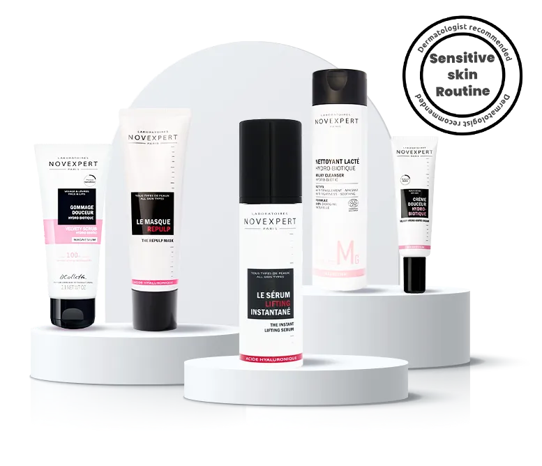 نوف اكسبرت وفرتلك حلول لأغلب مشاكل البشرة الحساسة والتي تشمل الالتهابات الجلدية، احمرار وتهيج الجلد وفرط الحساسية من المواد الكيميائية والعطور والأصباغ الموجودة فى بعض المنتجات، لذلك سحرك بيقدملك روتين متكامل للعناية بالبشرة الحساسة من نوف اكسبرت، يتميز بقوامه الناعم وملمسه الكريمي على البشرة الحساسة، يتكون من غسول ميلكي الخالي من الصابون والذي يعمل على تنظيف البشرة بدون تجريد الجلد من طبقة الحماية الطبيعية، ويحتوي على مقشر البشرة الكريمى والغني بالماغنسيوم ومكونات أخرى طبيعية 100% تعمل على تقشير البشرة بلطف وتغذيتها، بالاضافة إلى ماسك البشرة المغذي والمهدىء للاحمرار، وأيضا سيروم شد الوجه الفوري الذي يعيد شباب البشرة ويقلل من الخطوط الرفيعة، واخيرا كريم الترطيب هيدرو بيوتك المضاد لحساسية الوجه والمعروف بخصائصه الفريدة لحماية البشرة كم التحسس والشيخوخة.